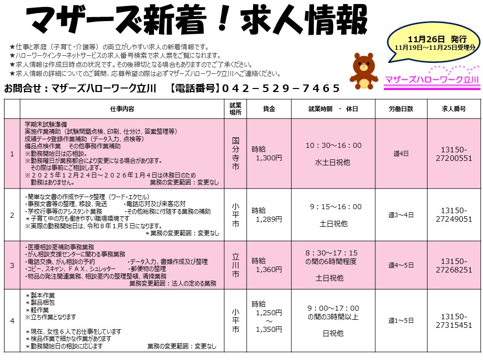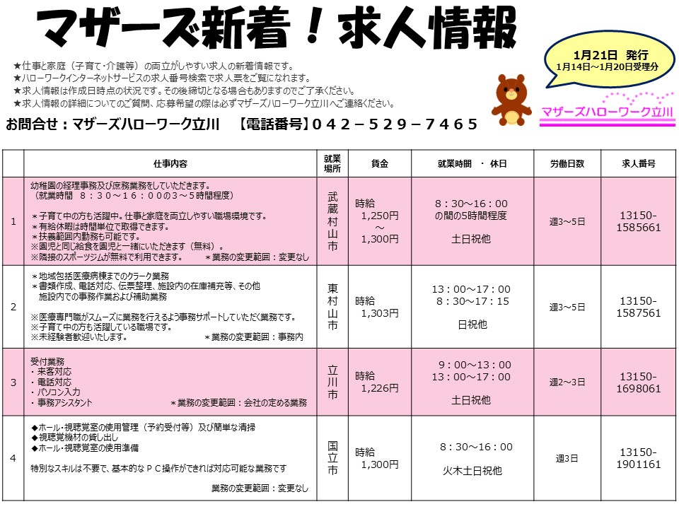 マザーズハローワーク立川 新着求人情報
