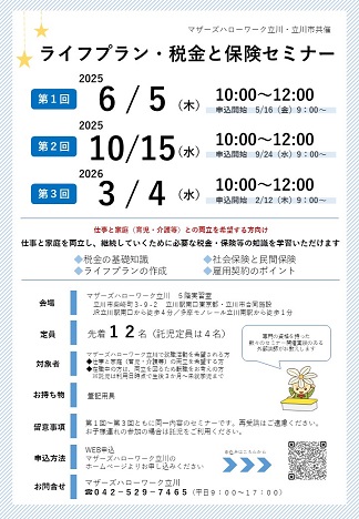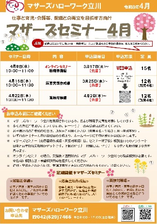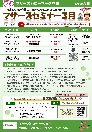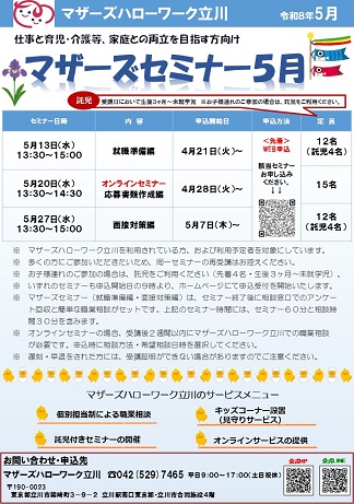 マザーズハローワーク立川は、仕事と家庭(育児・介護等)の両立を希望される方を支援する専門のハローワークです。