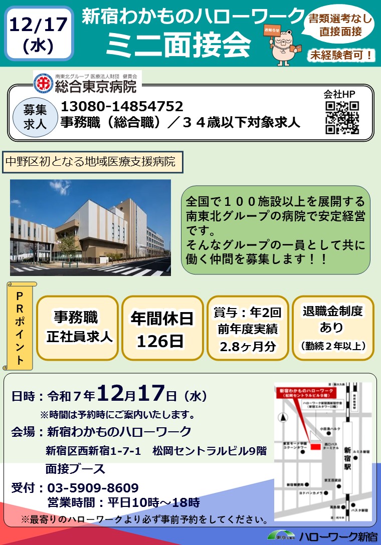 - 12/17(水)新宿わかものミニ面接会のお知らせ【医療法人社団 健貢会 総合東京病院】