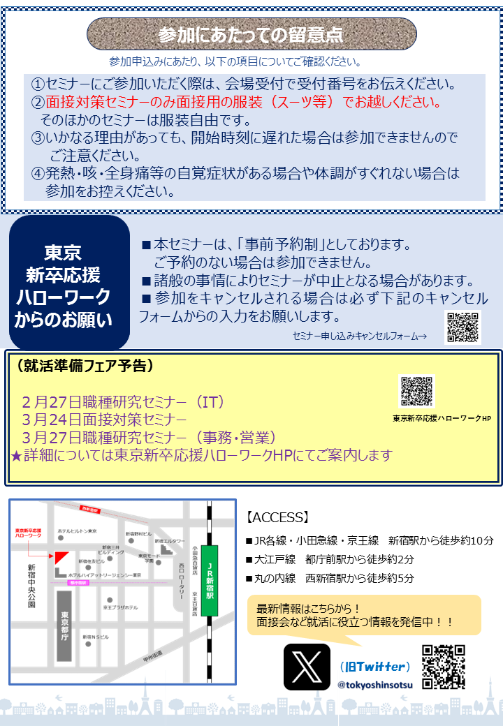 - 東京新卒応援ハローワーク 「出会いのフロア」(新宿区西新宿2-7-1新宿第一生命ビルディング21階)