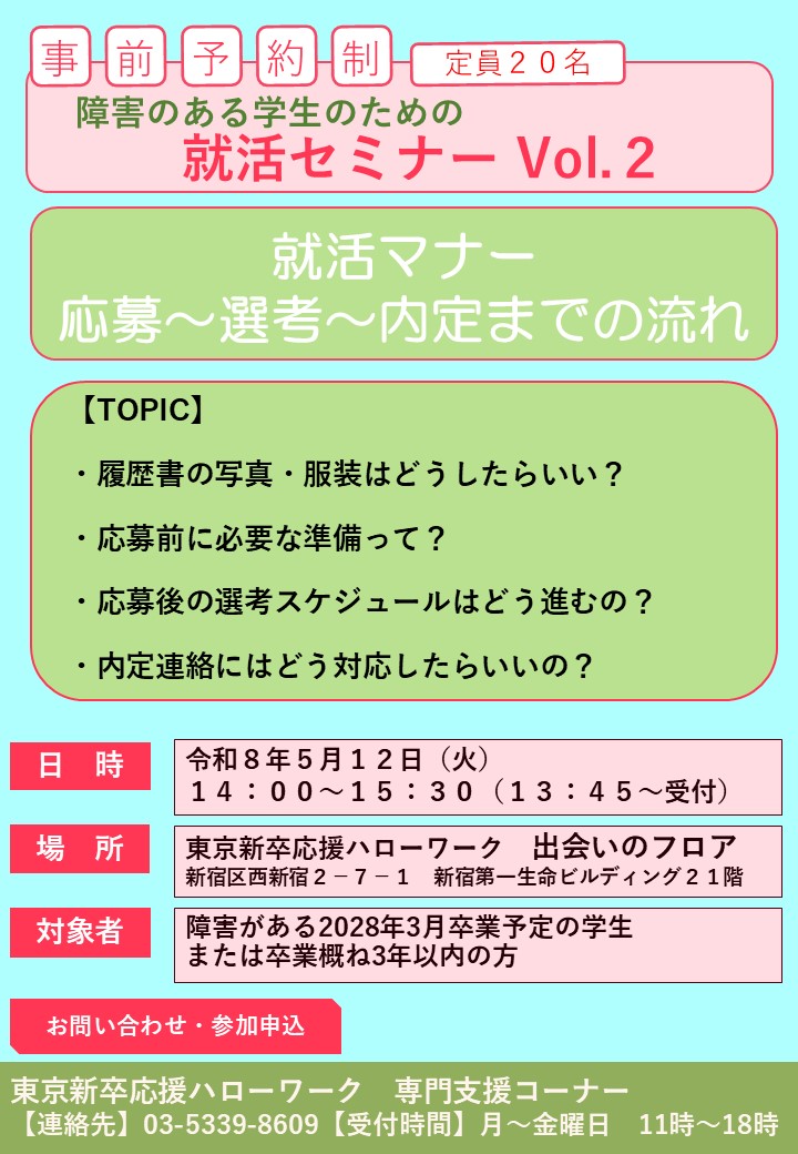 - 障害学生向け就職セミナーvol.2「就活の流れ・就活マナー」のお知らせ(5月12日)