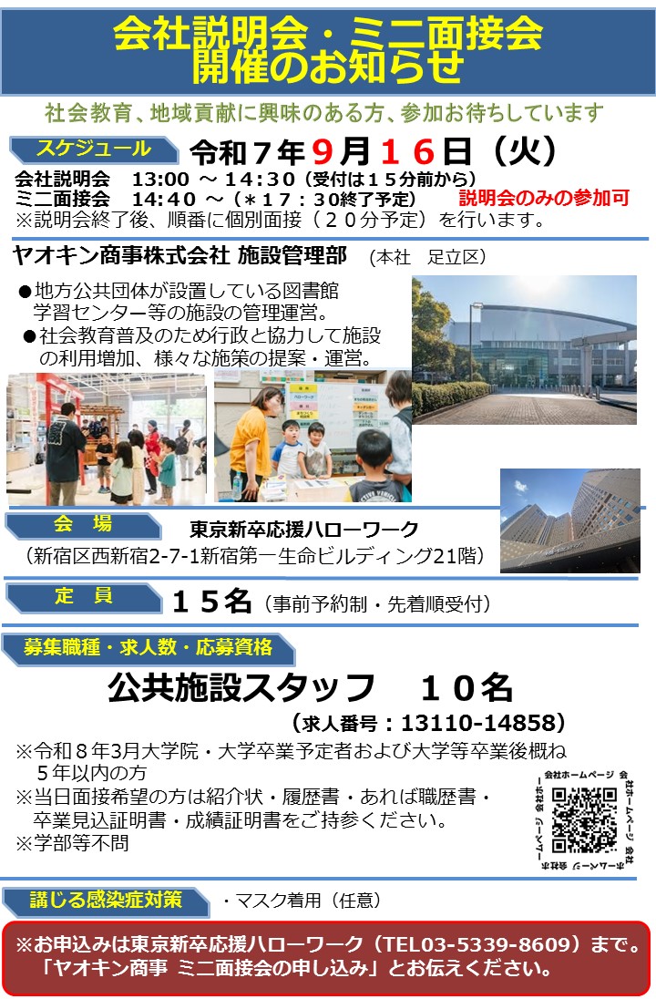 - ヤオキン商事株式会社 施設管理部会社説明会・ミニ面接会のお知らせ