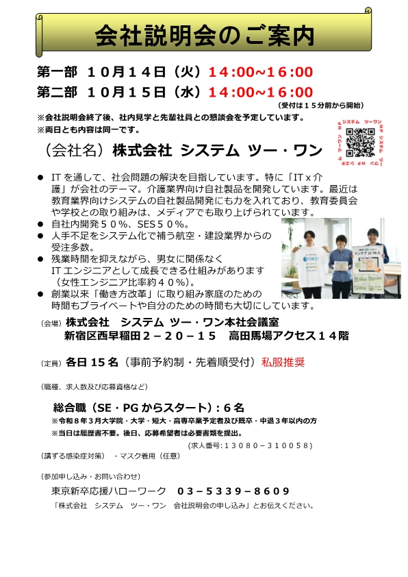 - 株式会社システム ツー・ワン会社説明会のお知らせ