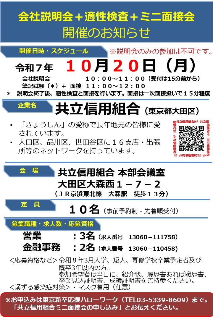 - 共立信用組合会社説明会・適性検査・ミニ面接会のお知らせ