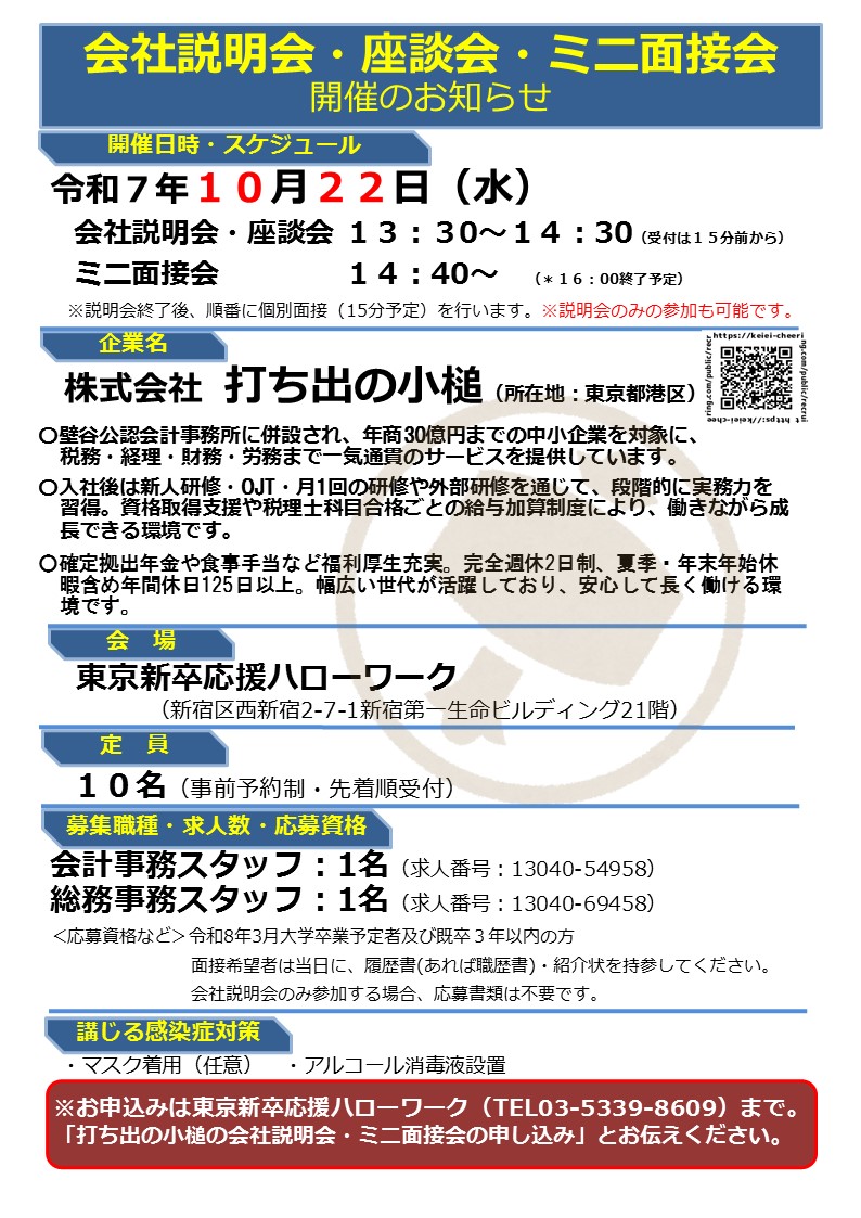- 株式会社 打ち出の小槌会社説明会・座談会・ミニ面接会のお知らせ