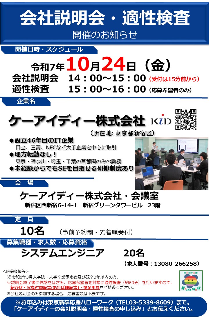 - ケーアイディー株式会社会社説明会・適性検査のお知らせ