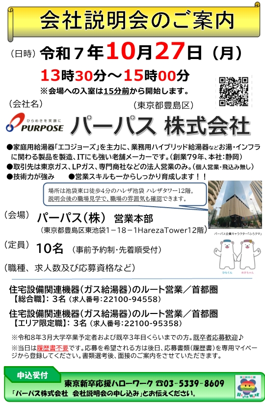 - パーパス株式会社 営業本部(豊島区東池袋1-18-1HarezaTower12階)