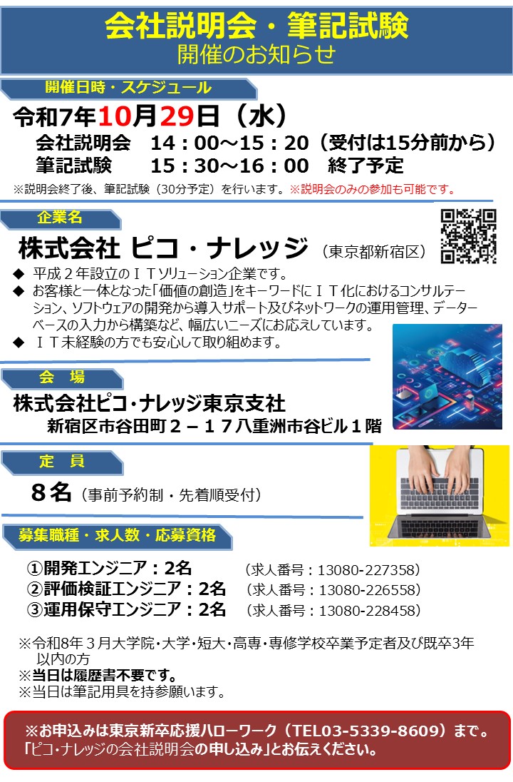 - 株式会社ピコ・ナレッジ会社説明会・筆記試験のお知らせ