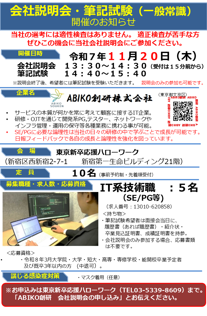 - ABIKO創研株式会社会社説明会・筆記試験のお知らせ