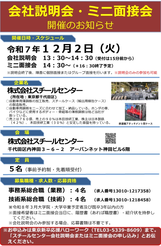 - 株式会社スチールセンター会社説明会・ミニ面接会のお知らせ