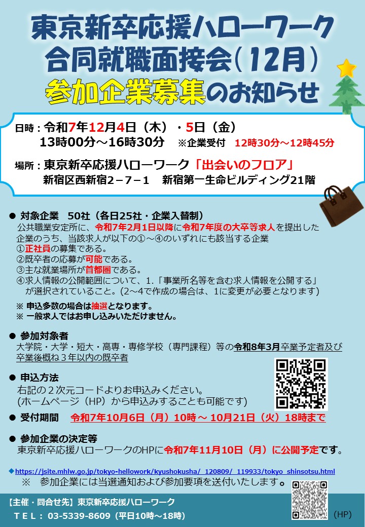 - 東京新卒応援ハローワーク合同就職面接会(12月4日・5日)参加企業募集のお知らせ