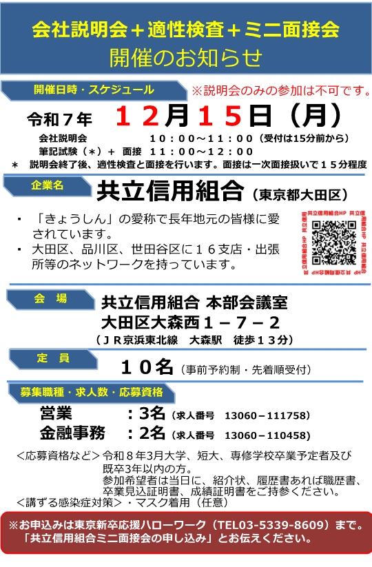 - 共立信用組合 会社説明会+適性検査+ミニ面接会のお知らせ