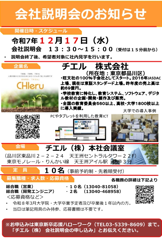 - 令和7年12月17日(水)会社説明会:13時30分~15時00分(受付は15分前から)