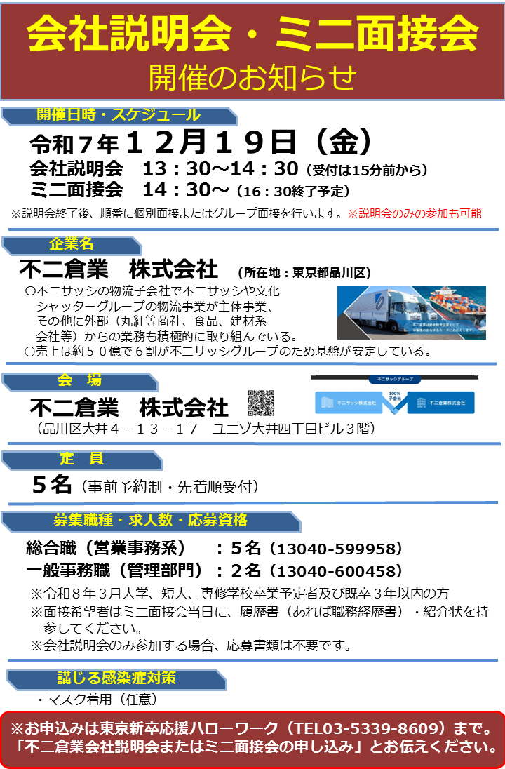 - 不二倉業株式会社会社説明会・ミニ面接会のお知らせ
