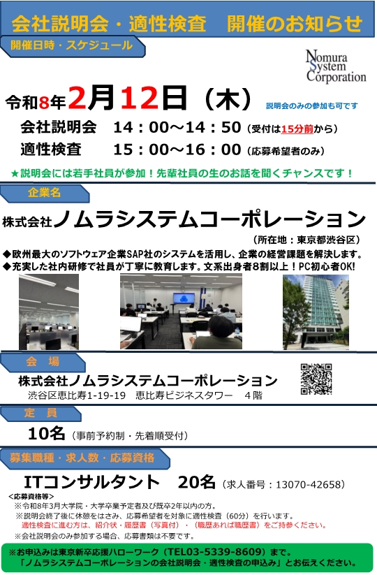 - 株式会社ノムラシステムコーポレーション 会社説明会・適性検査のお知らせ