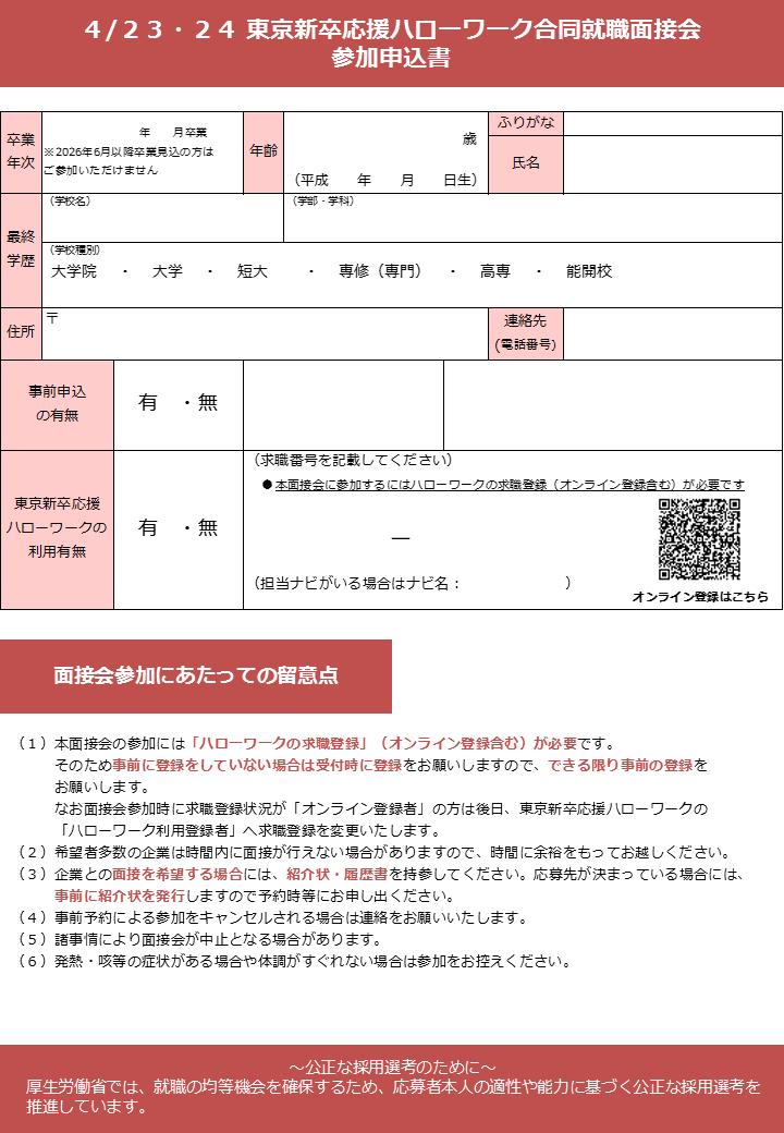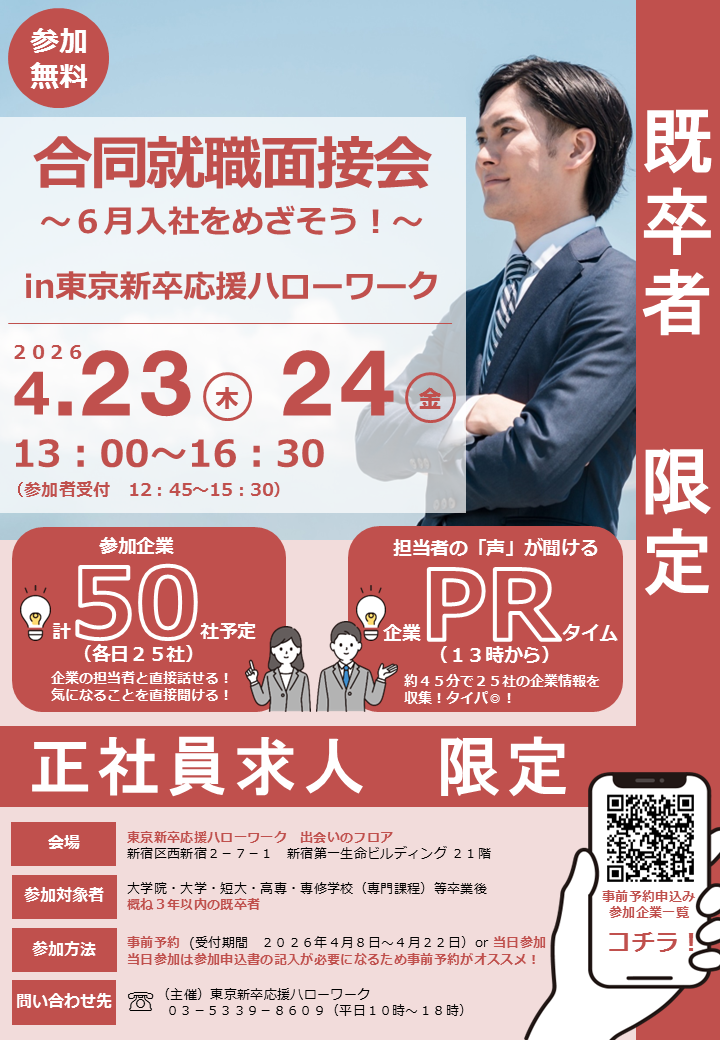 - 【既卒者限定】東京新卒応援ハローワーク合同就職面接会(4月23日・24日)事前予約のお知らせ
