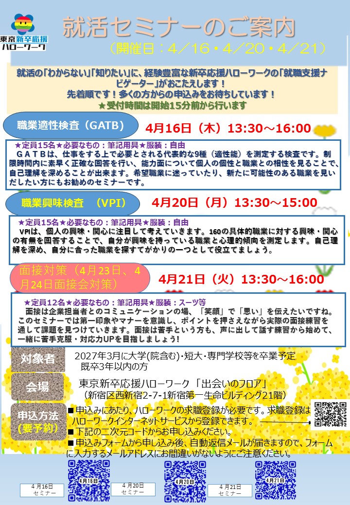 - 東京新卒応援ハローワーク 「出会いのフロア」(新宿区西新宿2-7-1新宿第一生命ビルディング21階)