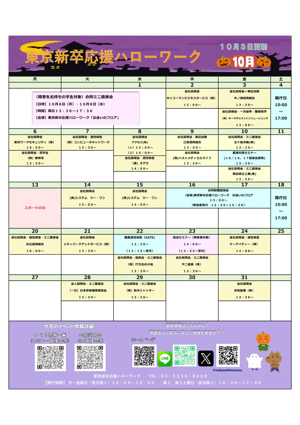 イベントカレンダー(10月)のダウンロード 東京新卒応援ハローワークTOPへ