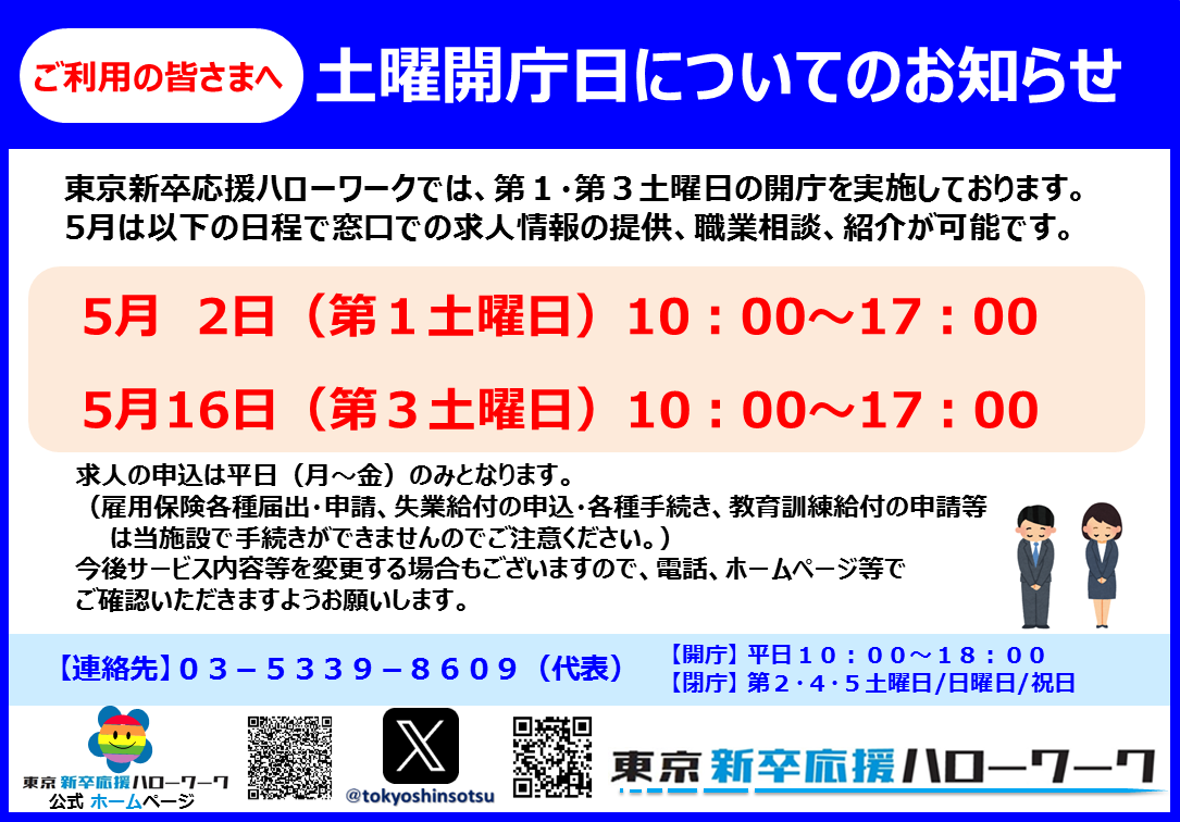 東京新卒応援ハローワークでは、第1・第3土曜日の開庁を実施しております。