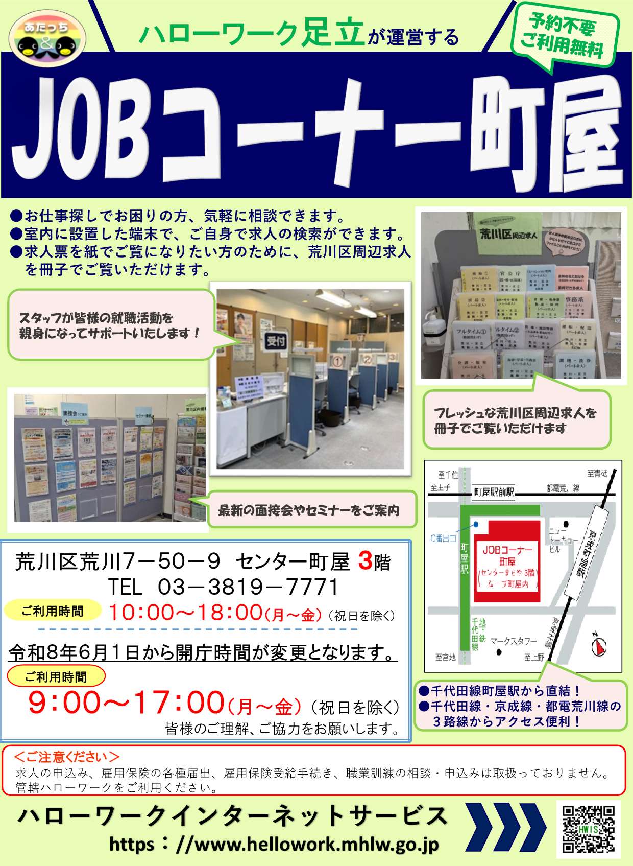 「JOBコーナー町屋」は令和8年6月1日(月)から開庁時間が9時~17時に変更となります。皆様のご理解・ご協力をお願いします。
