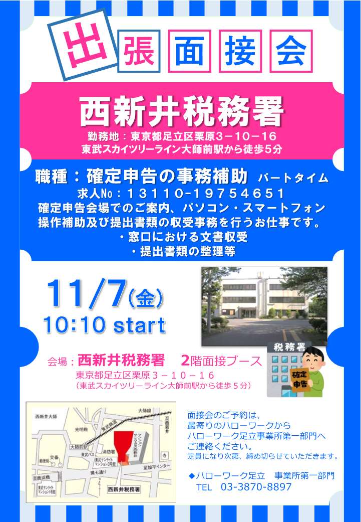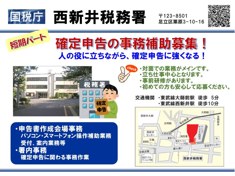 - 西新井税務署 2階面接ブース(足立区栗原3-10-16)東武スカイツリーライン大師前駅から徒歩5分
