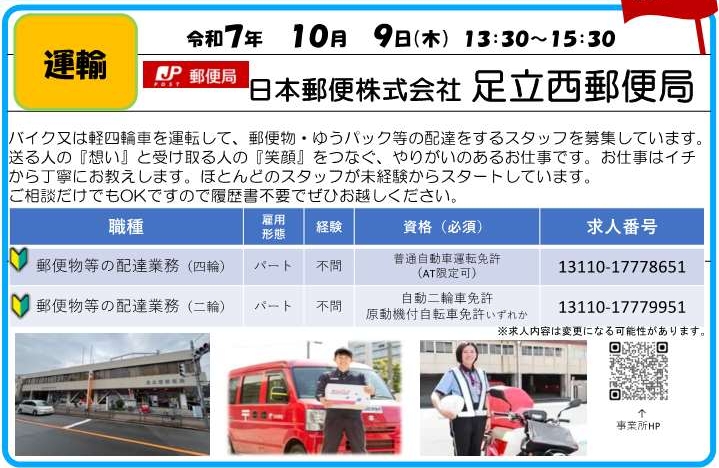 10月9日(木)【運輸】日本郵便株式会社 足立西郵便局