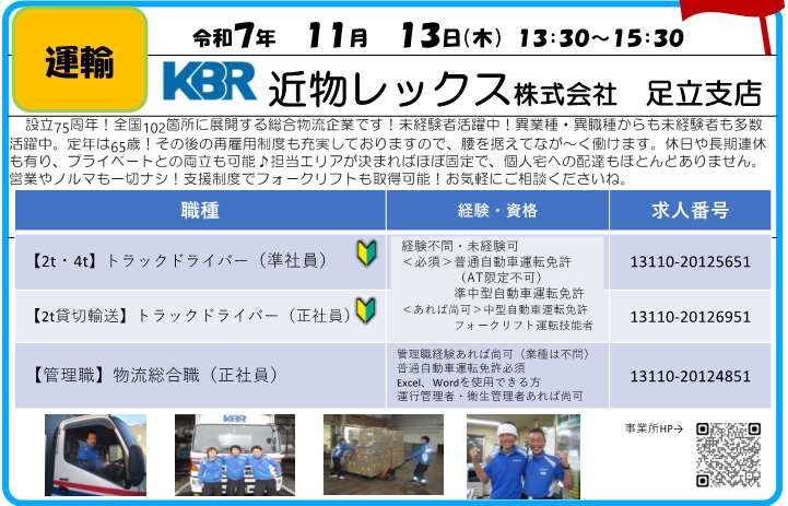 11月13日(木)【運輸】近物レックス株式会社 足立支店