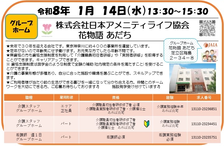 1月14日(水) 株式会社日本アメニティライフ協会 花物語あだち【グループホーム】