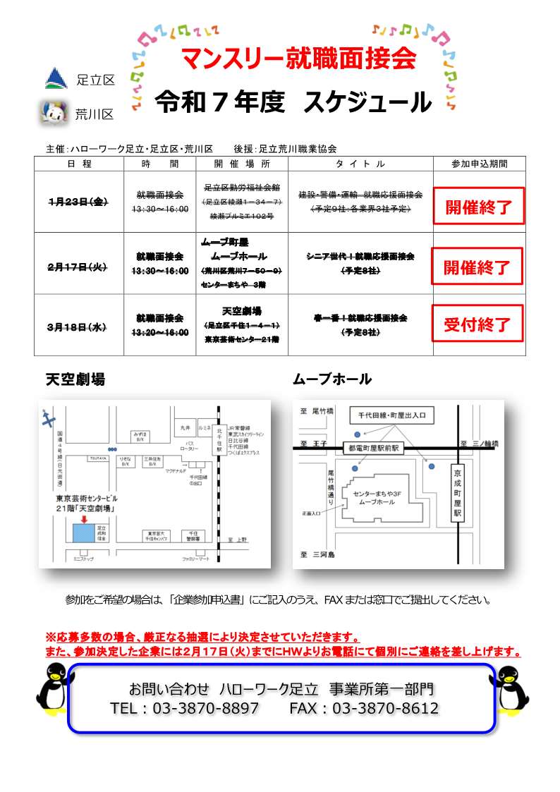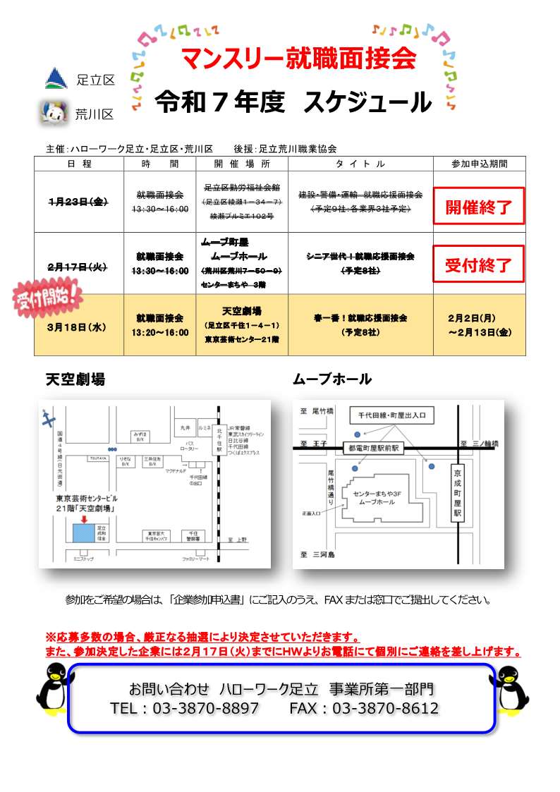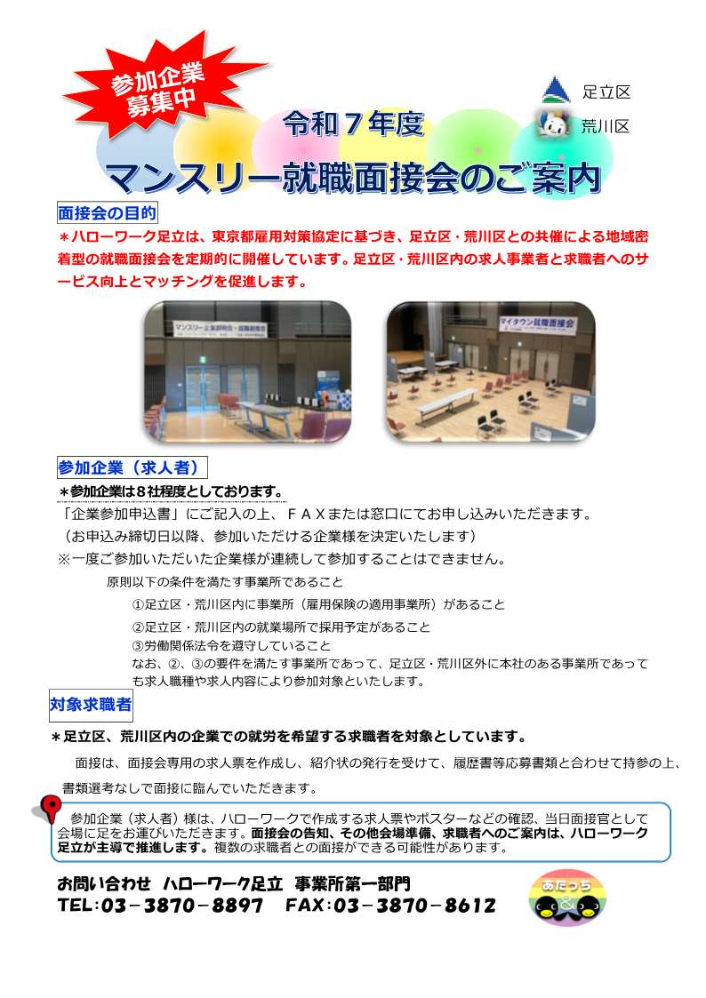 ハローワーク足立は、東京都雇用対策協定に基づき、足立区・荒川区との共催による地域密着型の就職面接会を定期的に開催しています。足立区・荒川区内の求人事業者と求職者へのサービス向上とマッチングを促進します。