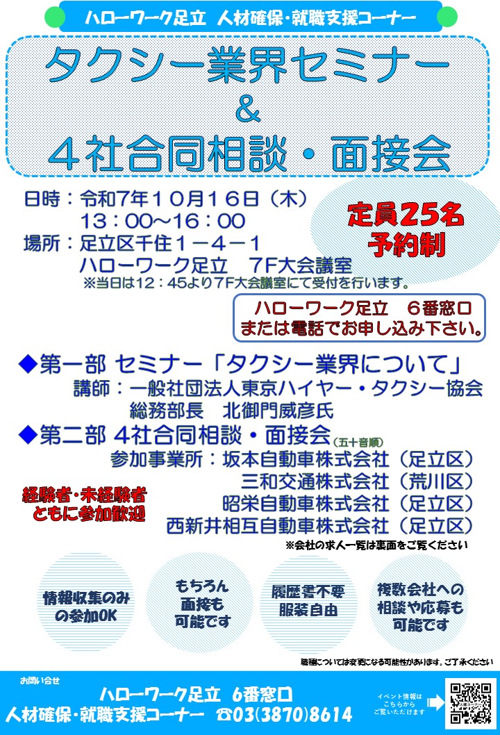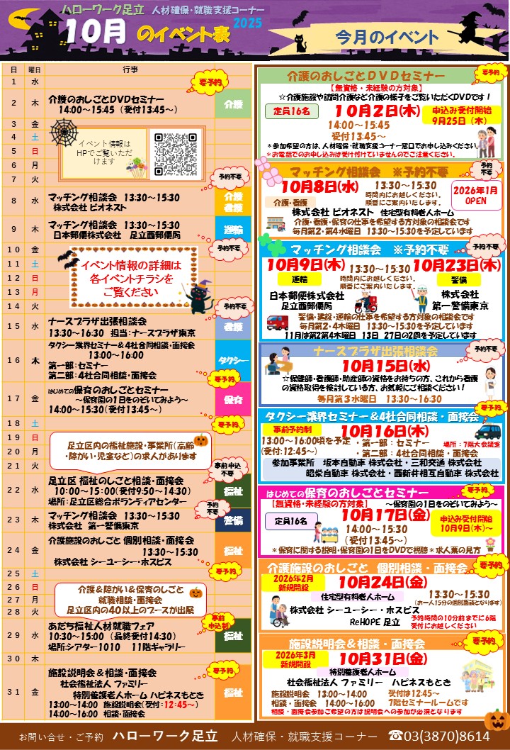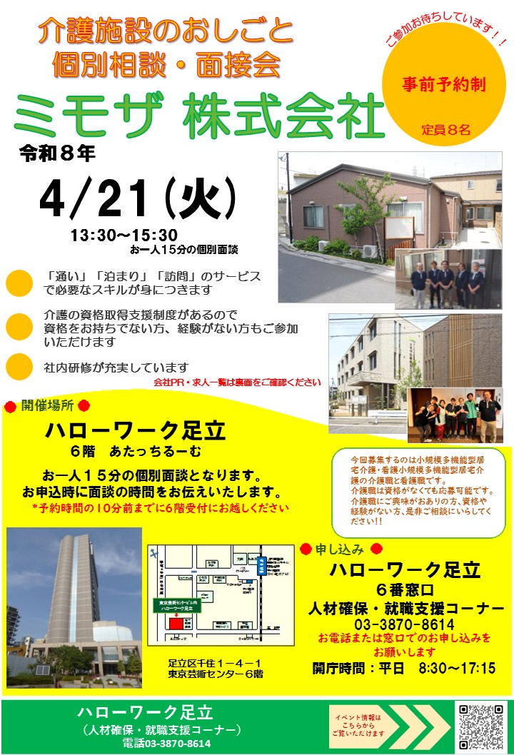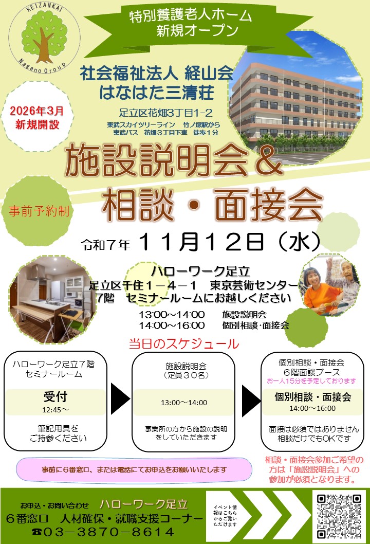 医療・福祉(看護・介護・保育)、建設、警備、運輸分野の総合専門窓口として求職者・求人者双方の支援を行っています。都内8か所に設置されており、HW足立はその一つになります。