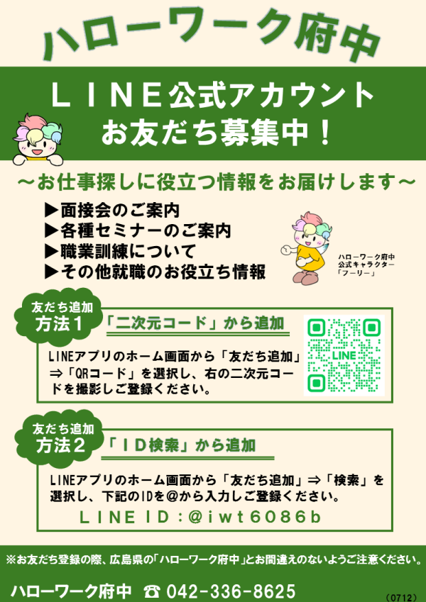 令和7年12月15日(月)より ハローワーク府中公式LINEでの配信を開始しました。 お役立ち情報盛りだくさん、ぜひお友だち登録をお願いします!