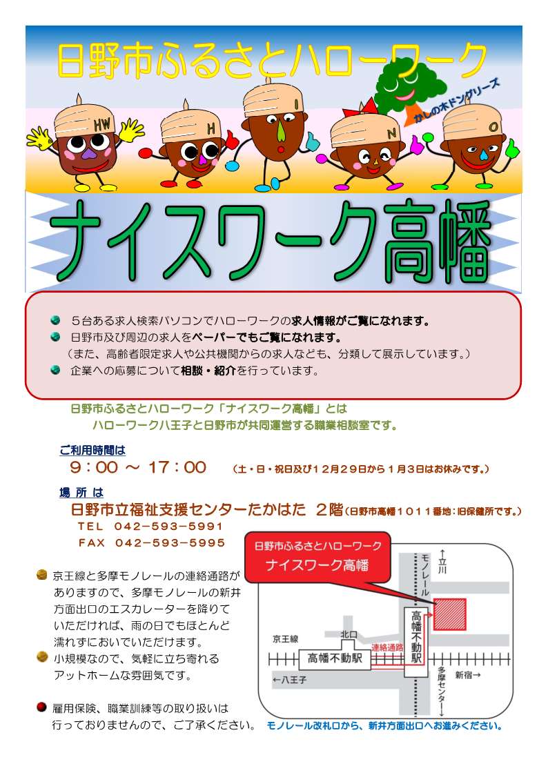 高幡不動駅前の「ナイスワーク高幡」は、ハローワーク八王子と日野市が共同で運営する職業相談・職業紹介専門の公共施設です。