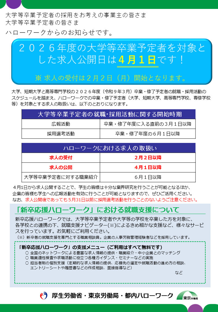 なお、ハローワークにおける求人票の公開は令和8年4月1日から(インターネットによる求人票の公開も同様)、大学等卒業予定者への職業紹介は令和8年6月1日からとなります。
