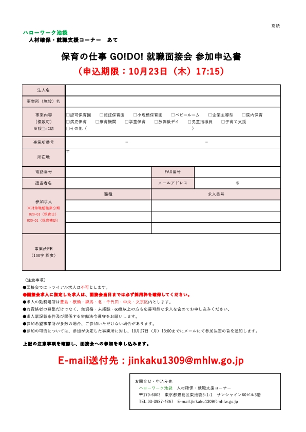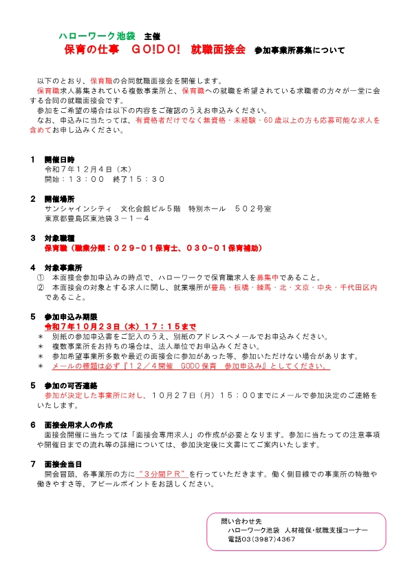 ハローワーク池袋 人材確保・就職支援コーナーからお知らせいたします。