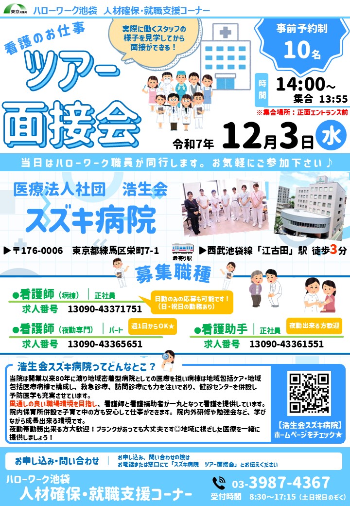 令和7年12月3日(水)の14時より『医療法人社団浩生会 スズキ病院 ツアー面接会』を開催いたします。