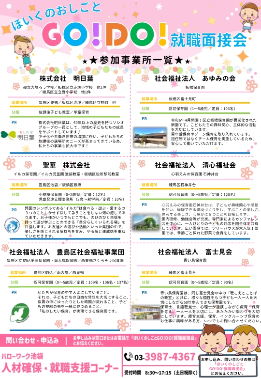 当日は参加法人のPRタイムに始まり、各法人のブースで直接採用面接を受けられるほか、保育職で働くことの不安や疑問についての相談や、事業所の雰囲気やお仕事内容の詳しい説明を受けられます。