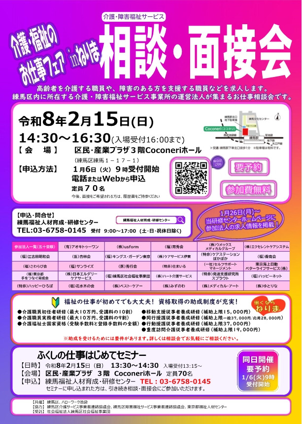 令和8年2月15日(日)の14:30より、『介護・福祉のお仕事フェアinねりま お仕事相談・面接会』が開催されます。