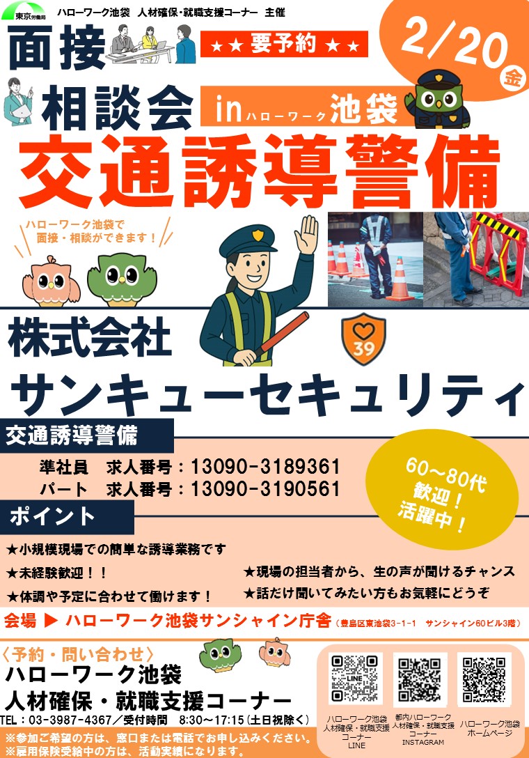 令和8年2月20日(金)に「株式会社サンキューセキュリティ」の面接・相談会を開催します。