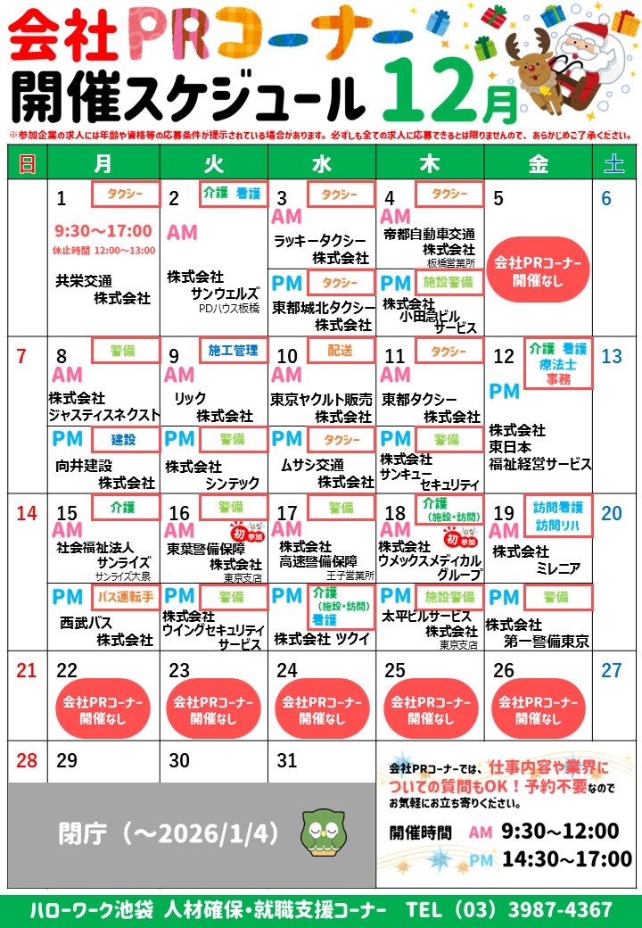 令和7年12月の会社PRコーナー開催スケジュールをご案内します。