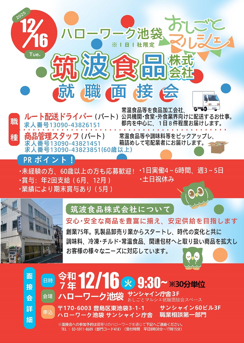 12月16日(火)筑波食品株式会社 おしごとマルシェ~就職面接会~のお知らせ