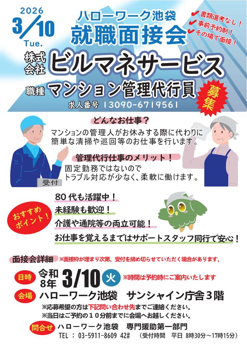 3月10日(火)ハローワーク池袋 就職面接会(株式会社 ビルマネサービス)のお知らせ