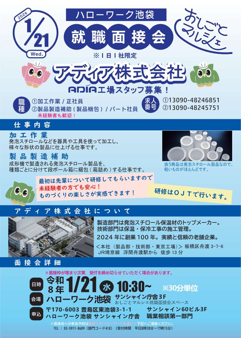 1月21日(水) アディア 株式会社 おしごとマルシェ~就職面接会~のお知らせ