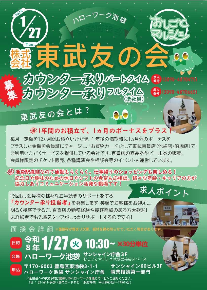 1月27日(火) 株式会社 東武友の会 おしごとマルシェ~就職面接会~のお知らせ