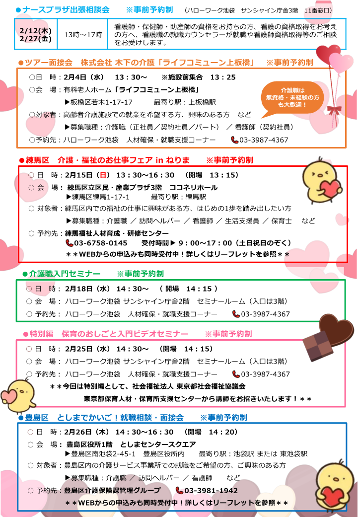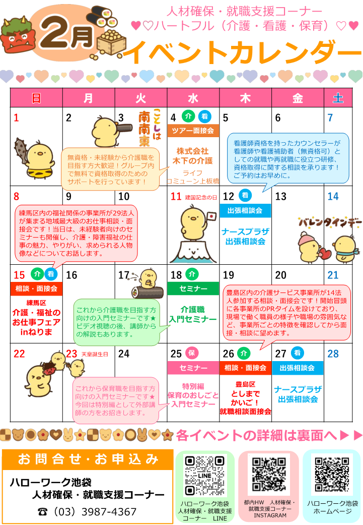 ハローワーク池袋 人材確保・就職支援コーナーでは、人出不足分野(介護・看護・保育、建設・警備・運輸)にご興味をお持ちお皆様のために、LINE専用アカウントを開設しました! また、東京ハローワークの人材確保・就職支援コーナーのインスタグラムも発信してます!ぜひ下記リンクからご覧ください。