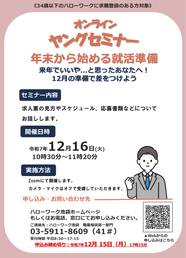 ハローワーク池袋職業相談第一部門の窓口または電話でお申し込みください。