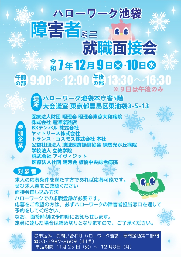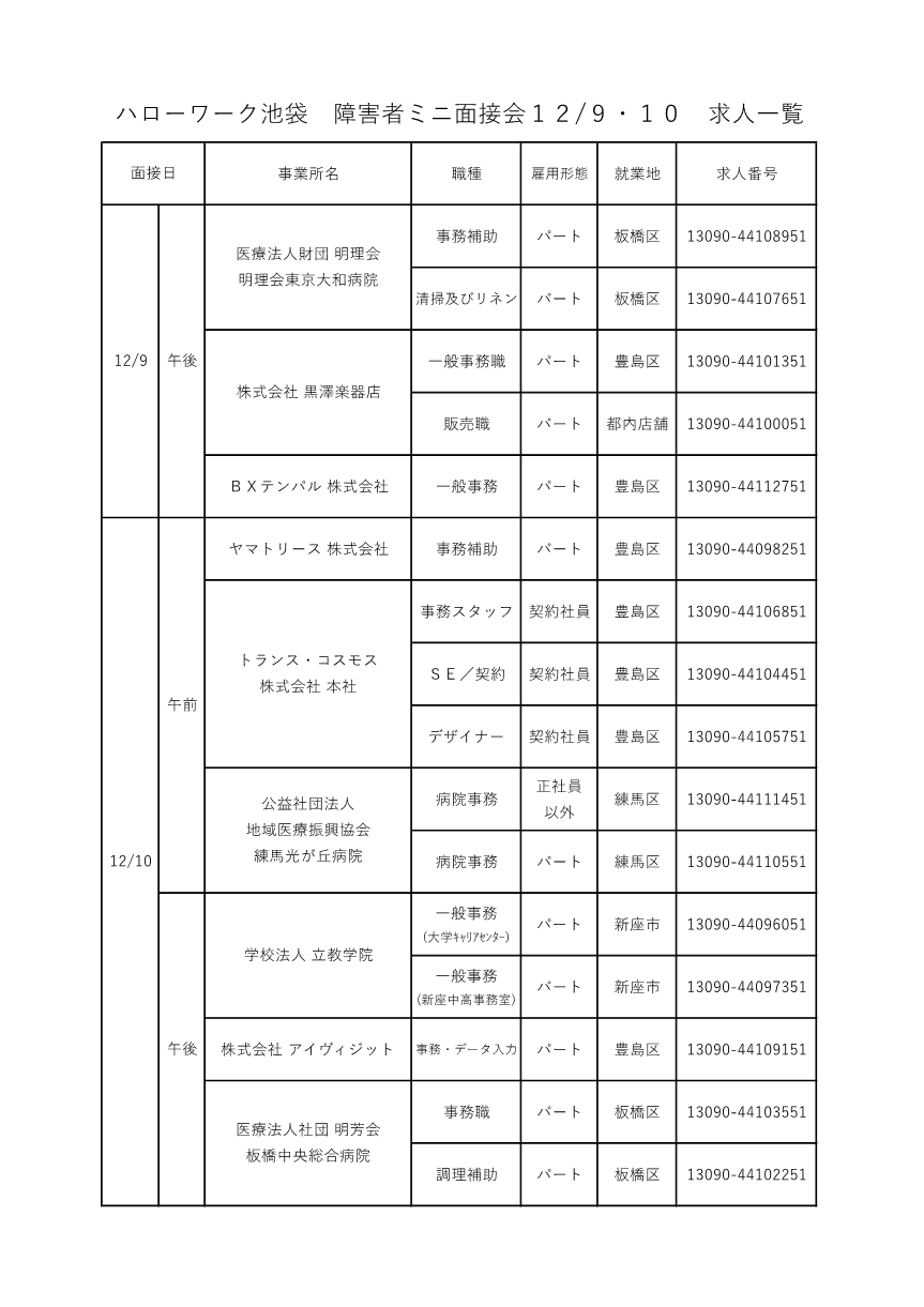 12月9日(火)・10日(水)開催 ハローワーク池袋 障害者ミニ就職面接会
