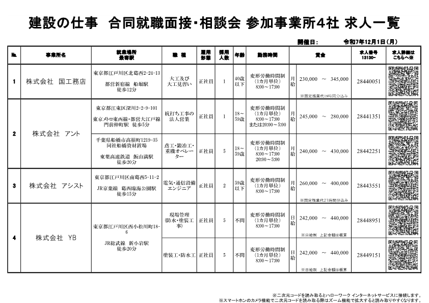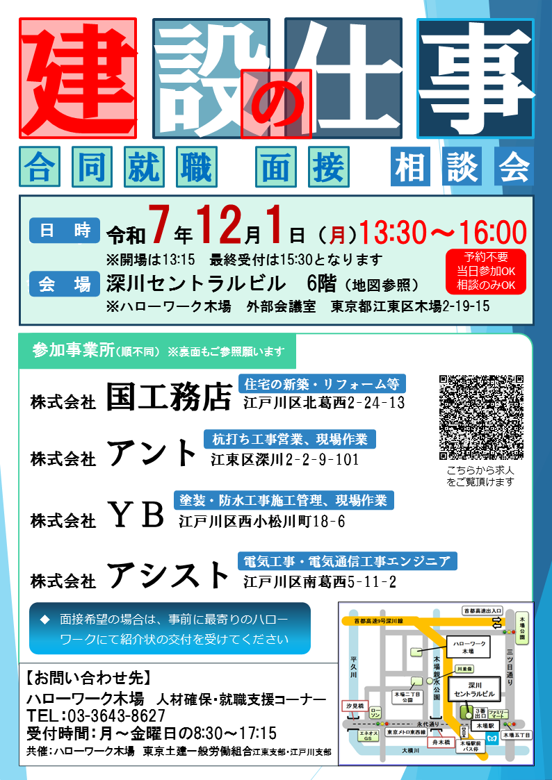 - 予約不要、当日参加OK、相談のみOK※面接希望の場合は、事前に最寄りのハローワークにて紹介状の交付を受けてください。