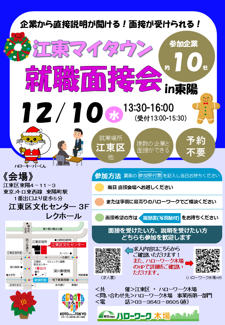- 事前(12月9日15時まで)にお申込していただくか、参加受付票をご記入のうえ、当日ご持参ください。又は事前に最寄りのハローワークにてご相談ください。