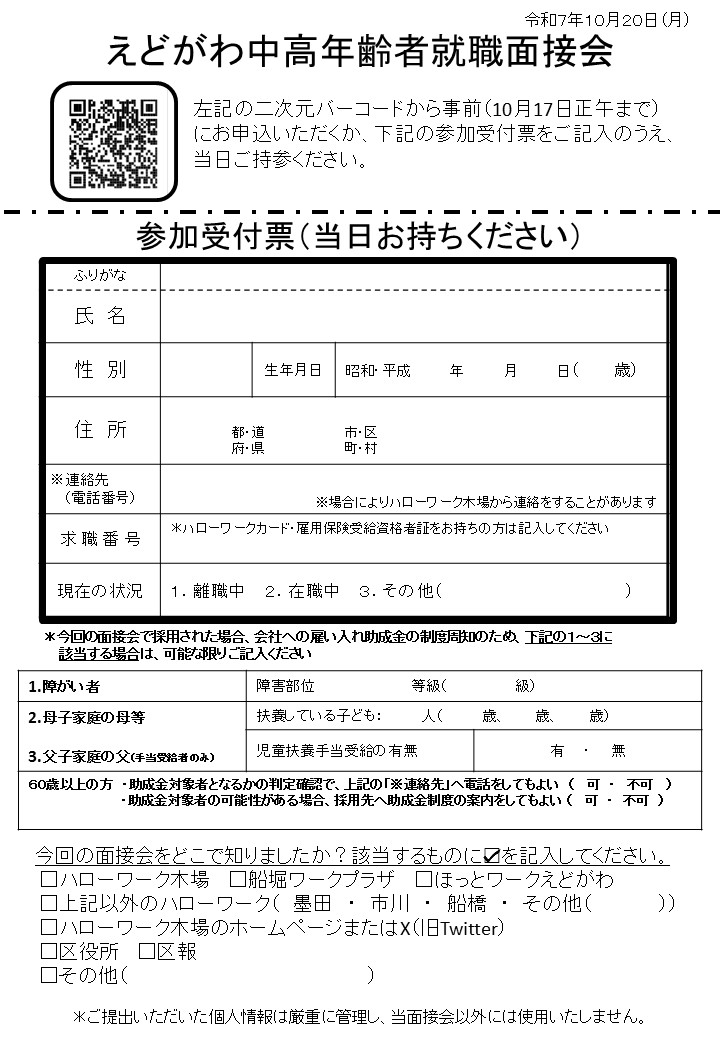 - 事前(10月17日正午まで)にお申込していただくか、参加受付票をご記入のうえ、当日ご持参ください。又は事前に最寄りのハローワークにてご相談ください。