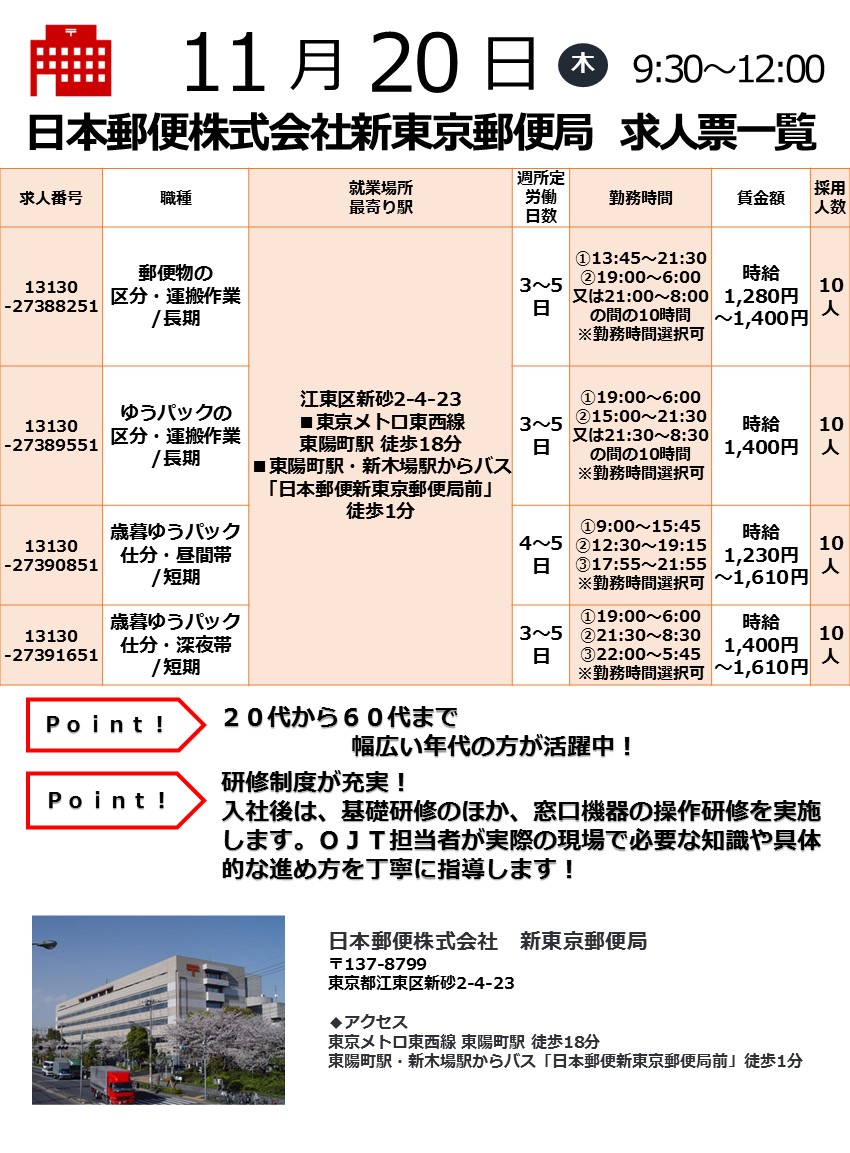 | 歳暮ゆうパック仕分・昼間帯(短期) | 13130-27390851 |